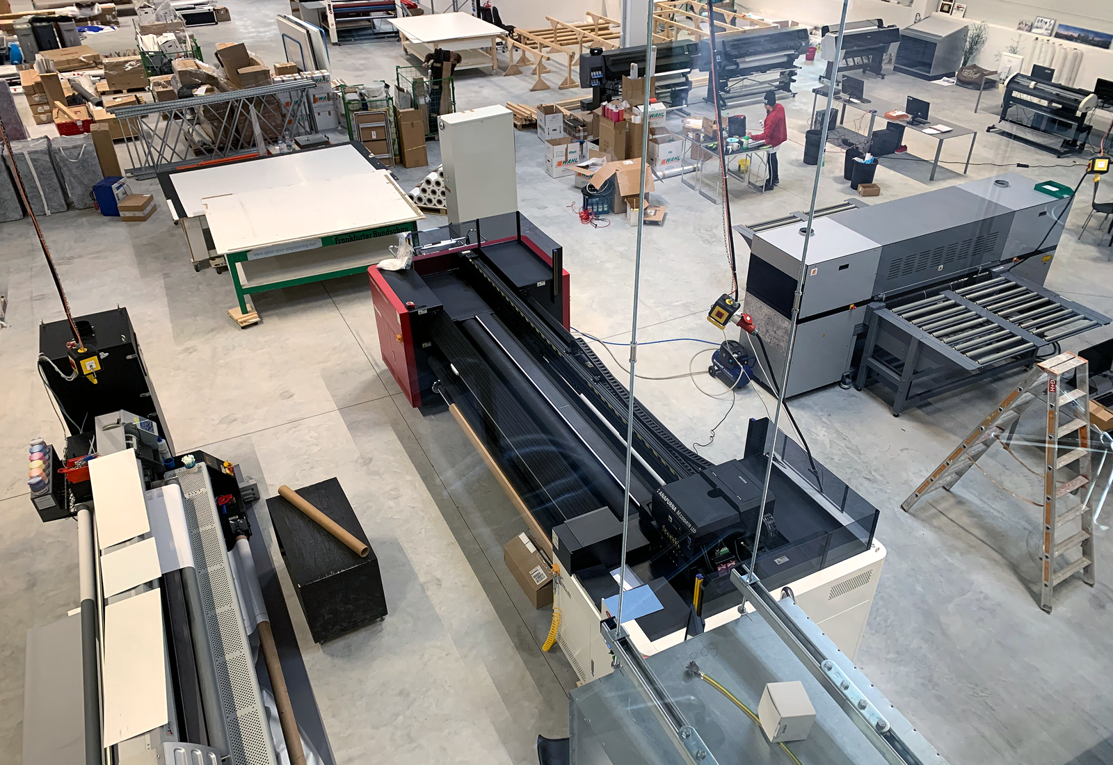 Our textile, UV, plate, latex and inkjet printers found their place in the spacious halls and we were also able to set up various special areas: An area for lamination, where the graphic prints are professionally finished. A carpentry workshop that gives us maximum flexibility for individual custom-made products. And an in-house sewing department, where textile solutions can be implemented with precision. The result is a production environment that was designed from the outset to realize projects of any size reliably and to a high standard of quality.