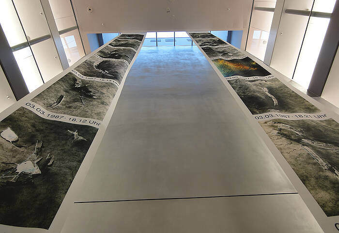 The focus is on the installation "EIS-ZEICHEN-ZEIT", which guests will come across at the Central Library (Hasengasse 4) from 28 January to 12 February. On two 13-meter-long strips of fabric that run through the entire three floors of the public library, Wiesner has banned "fleeting signs of nature". The panels were produced by MARTINCOLOR on special HighTec material, then assembled according to the requirements and professionally assembled on site by the MARTINCOLOR assembly team.