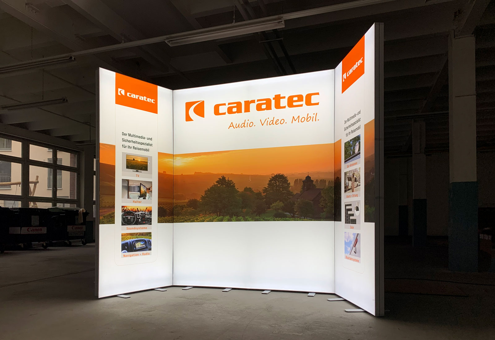Our LED exhibition stan d system ALU LightUp is impressive in its effect and inexpensive. ALU LightUp is available in the system widths 85 cm, 100 cm and 200 cm. The individual light frame modules can be combined with one another and put together to form an LED exhibition stand. A single LED light wall can also be used for smaller trade fairs and events. It is particularly practical that ALU LightUp can be provided with luminous slide prints on both sides. The LED exhibition wall can also be positioned in the middle of a room or on a trade fair stand. Using the example of our customer Caratec GmbH you can see various assembly options.