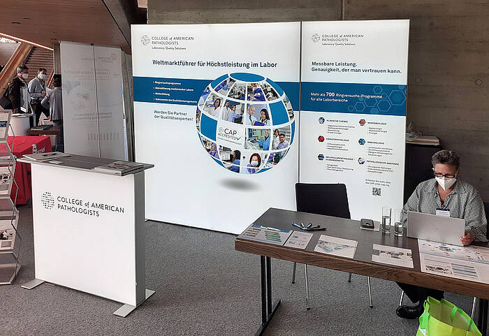 LED exhibition walls are also the ideal partner for smaller in-house exhibitions, congresses and recruitment events. Here you can see an ALU STAR exhibition stand that can be set up effectively as a stand-alone stand, i.e. without an exhibition booth, or as a back wall on an exhibition stand with an exhibition booth. Thanks to the possibility of using several LED exhibition wall formats, the individual walls can be connected straight or as corners. The ideal complement to an LED exhibition wall is an LED counter. Our customer "College of American Pathologists" uses the ALU STAR Basic counter here. For more information, please call us on +49 (0) 69 756080-84 or send us an e-mail with your inquiry.