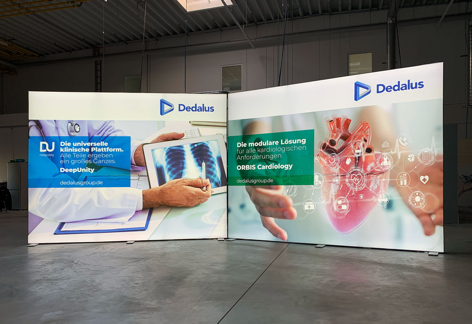 For Dedalus HealthCare GmbH we created an LED exhibition wall covered on both sides with foldable slide material. The customer's choice fell on our ALU STAR modular illuminated wall. This LED exhibition system is not only stable, bright and mobile, but can also be adjusted in size. I.e. you first order, for example, a 2 m wide LED exhibition wall. For another event, however, you will need a 3 m wide LED exhibition wall. No problem with ALU STAR. An extension module turns the 2 m wide basic module into a 3 m wide illuminated wall! Do you have any questions about this? Then give us a call. We advise you in detail and competently.