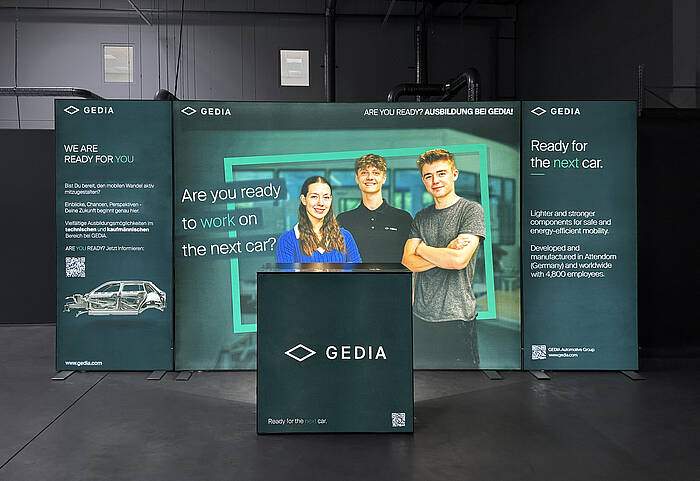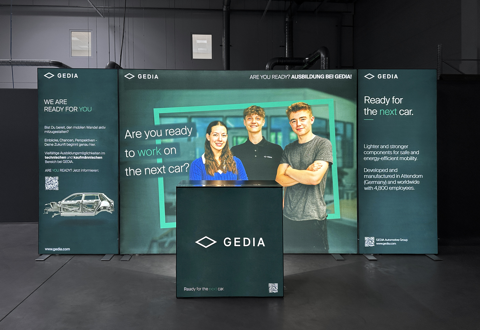 ALU STAR exhibition walls can be used to construct a complete illuminated exhibition stand that can be used for many different purposes. Thanks to the modular design of ALU STAR, individual exhibition walls can be used in different combinations. GEDIA Gebrüder Dingerkus GmbH ordered a 300x230 cm LED exhibition wall as well as two smaller 100x230 cm ALU STAR illuminated displays. The small, 100 cm wide lighting systems allow the exhibitor to present the 300 cm wide back wall in various combinations. Either the 300 cm wide rear wall can be extended to a total width of 500 cm, or the 100 cm wide illuminated walls can be placed across the corner, giving the exhibition stand a different shape and appearance. Adding an illuminated counter (also from the ALU STAR family) to the exhibition walls creates a fully-fledged modular exhibition stand.