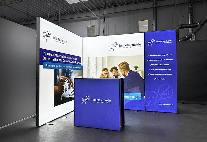 With our ALU LightUp self-assembly exhibition stand, even inexperienced exhibitors can easily set up and dismantle their exhibition stand themselves. The illuminated exhibition wall shown in this picture consists of aluminum profiles that are assembled to form an LED frame. This frame is covered on both sides with advertising graphics that are illuminated from behind. Two feet, which are simply unscrewed for assembly, ensure that the stand is stable. ALU LightUp illuminated walls are available in widths of 85 cm, 100 cm, and 200 cm. The individual exhibition walls can be firmly joined together using connectors and thus arranged individually in relation to each other.