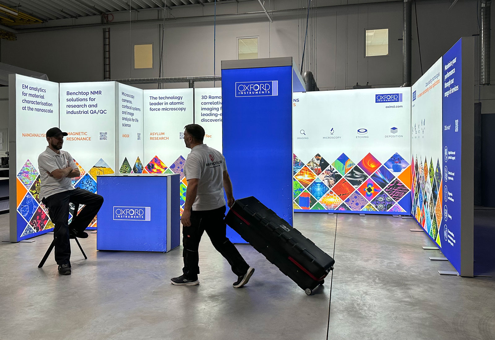 For the customer "Oxford Instruments" Martincolor produced the complete LED exhibition stand ALU STAR with the LED counter ALU STAR PLUS. The grandiose light spectacle is guaranteed by the power LEDs already integrated in the 12 cm wide aluminum profiles. The absolute eye-catcher is the bridge module. The storage room, which can be locked with a door, is particularly practical.