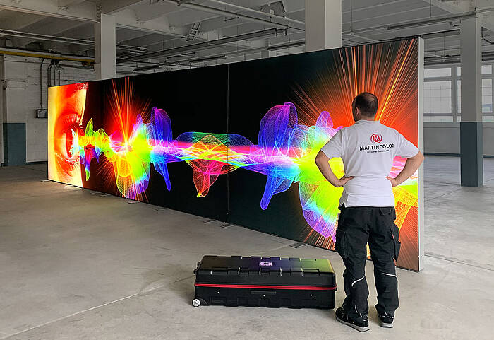 Impressive in the effect is the luminous exhibition wall, which we made for system engineering wood. The LED exhibition wall shown here consists of three ALU STAR luminous walls in the width of 1 x width 375 cm and 2 x 275 cm. If the light walls are put together, an LED exhibition wall of more than 20 m² total area is created. The light wall was played with foldable, textile diamaterial. A big advantage and therefore also suitable for self-builders is that ALU STAR luminaire walls can be set up with simple and tool-free plug connections. The transport of the fair walls, which are made of stable, 12 cm deep aluminum profiles, takes place in a robust and lightweight ABS rolling suitcase, which can also be transported in a normal car. More information about ALU STAR can be found here.