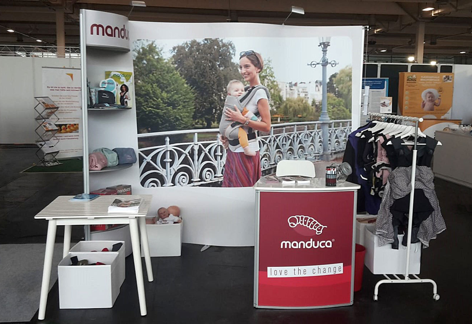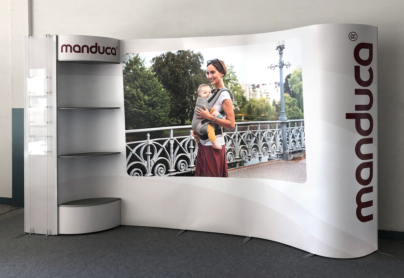 ISOframe wave opens up completely new possibilities for your exhibition stand. The exhibition system with the patented Flexi Link connection can be put into almost any desired shape - according to requirements and the given positioning possibilities. Depending on the application and requirement, any number of Flexi Link connectors are joined together, the linkage inserted and the entire display bent to the desired shape. The patented flexi-shaft connection ensures maximum stability even when bending and stretching the display up to 180 °. With matching extension modules, ISOframe can be extended by 80 cm units. Thanks to the quick-clamping connection elements, installation is possible without tools. Additional supports allow the installation of shelves, table elements, TFT or LCD screens. ISOframe wave is available in two heights: 2290 mm (Midi) and 2490 mm (Maxi). Our customer Wickelkinder Gmbh opted for the Midi version and chose the shelf and brochure holder module as an addition.