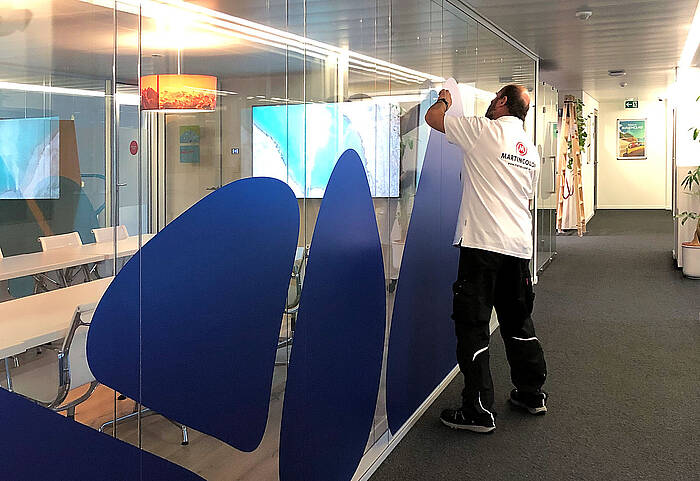 We designed the Swiss office for Merck KGaA with corporate design elements such as logos, key visuals, color foils and individually tailored office signage. A special highlight is the LED illuminated wall in the reception area in an impressive size. The display of the oversized LED light box was made on special LUX lighting material and guarantees the highest radiance and image brilliance. The attractive reception desk is particularly inviting for visitors. Another eye-catcher on the spacious office floor are two think tanks, which were also covered with a logo branding. All room dividers made of glass and the glass walls of the conference room were provided with individually designed colored film bodies. The effect is impressive! Do you have questions about this project? Then please contact our project manager Sonja Ewald at +49 (0) 69 756080-81.