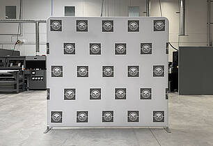 Most press walls consist of an aluminum frame that is light but stable. The graphics are usually printed on textile or panel materials. Textiles offer a high-quality, crease-resistant surface and vivid colour reproduction, while graphic panels produced using UV or latex printing have excellent sharpness of detail. In LED press walls, the illuminated frames are covered with brilliant textile material, which is produced using sublimation printing and ensures even illumination.