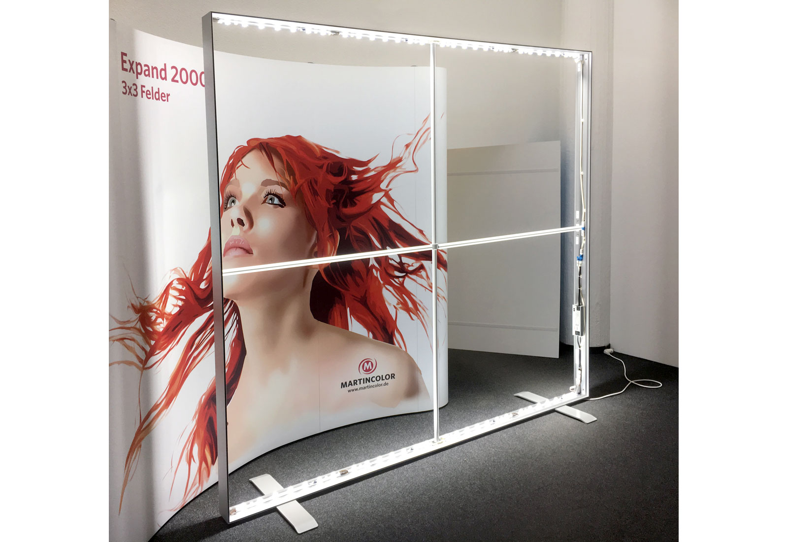 For an eye-catching presentation at smaller trade fairs and congresses, we produced a large-format light box for Deutsche Pfandbriefbank AG. MARTINCOLOR is a specialist in mobile illuminated displays and our range of mobile, easy-to-install light walls is versatile. Deutsche Pfandbriefbank AG decided in favor of the mobile illuminated wall OCTALUMINA. The special advantage of OCTALUMINA exhibition lighting walls is that they can be individually manufactured in size according to the specifications and wishes of our customers. Depending on the transport options, the aluminum profiles of the lighting system can be divided so that they are easy to transport. The construction of the luminous exhibition wall is also very simple. Since the pre-assembled LED lighting is located directly in the aluminum profiles, they only have to be plugged together and connected to form the structure. For the covering with individual graphic printing a particularly bright diamond material is used. Like many exhibition systems from the OCTANORM range, OCTALUMINA illuminated displays are covered with graphics on both sides.