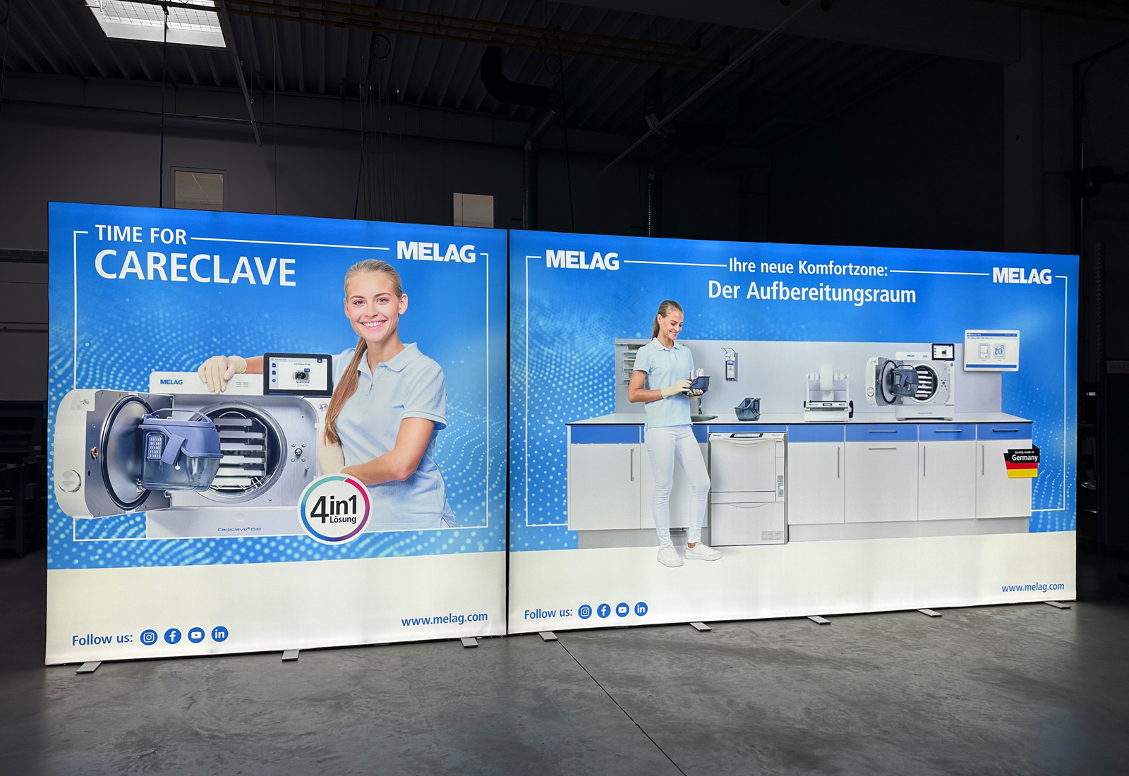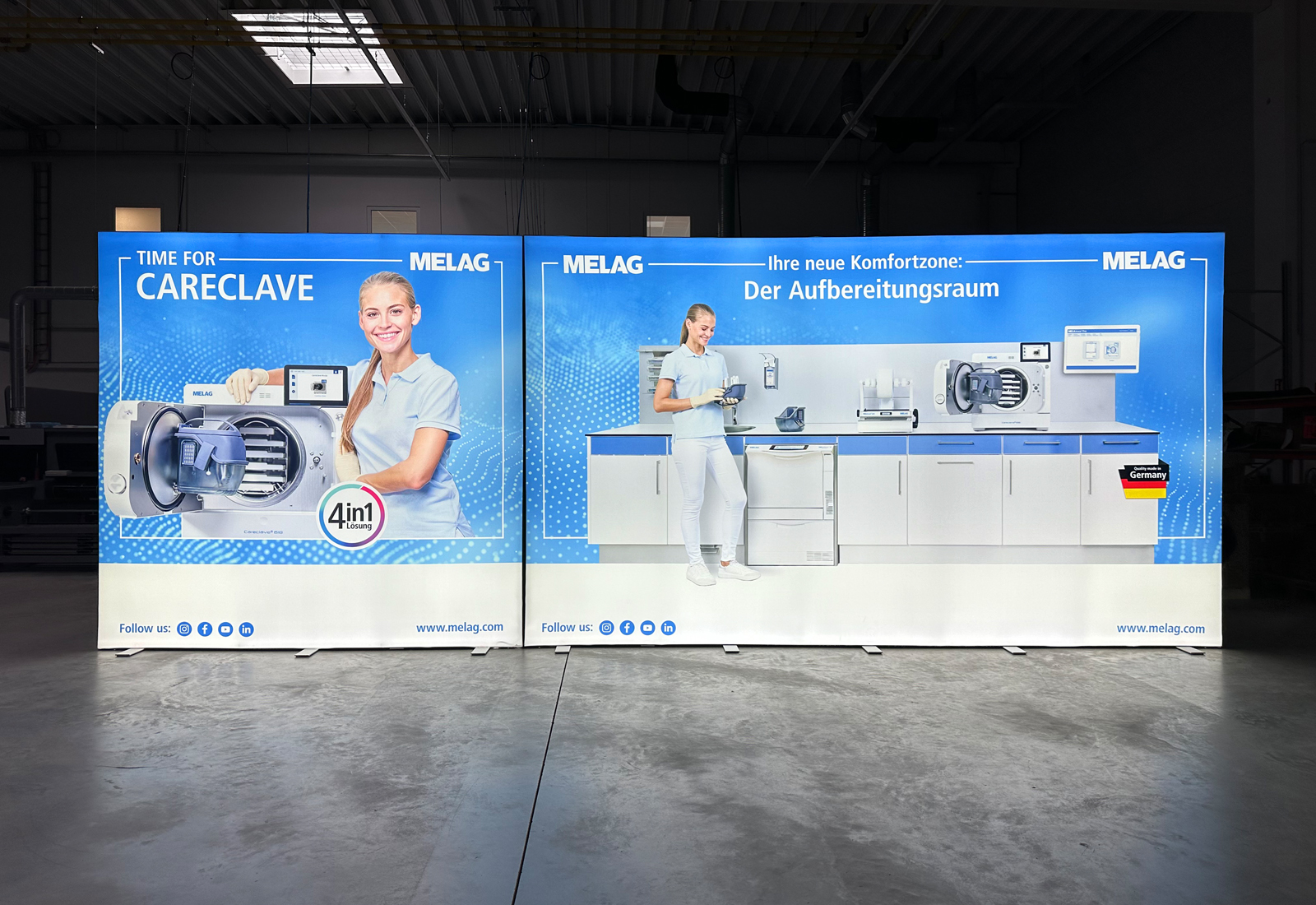 One of the fastest set up LED exhibition walls is ALU LightUp. The 8 cm wide system profile made of aluminum is simply put together for assembly. The LED rails are already in the profiles. The feet are already attached to the base of the light wall. They are simply unscrewed and the system can be used free-standing. The individualized graphic print is double-sided. The quick assembly and the small-format transport in a rollable transport trolley also convinced our customer MELAG.