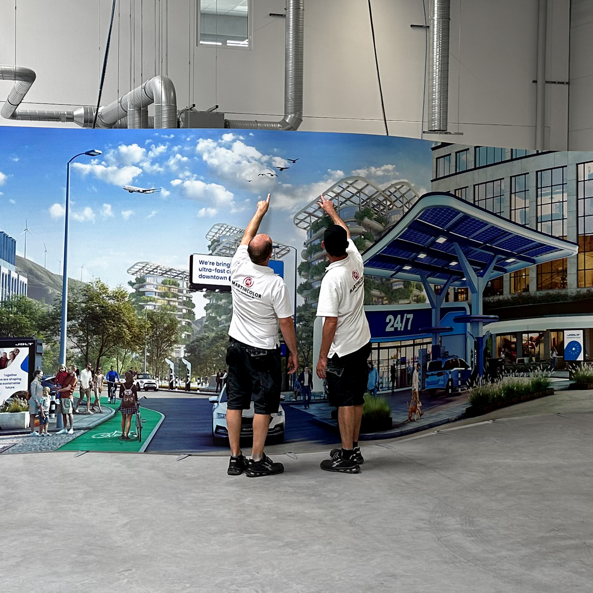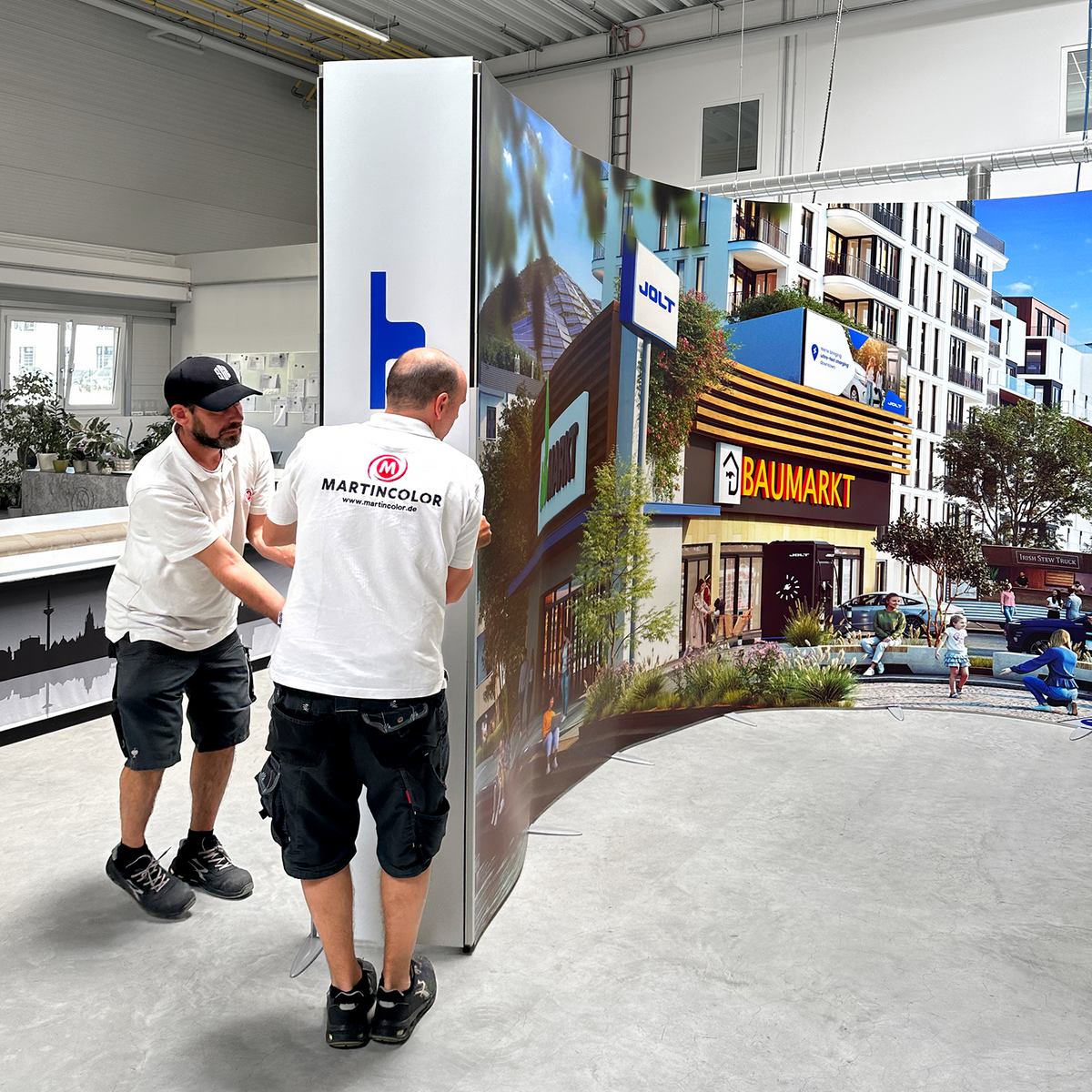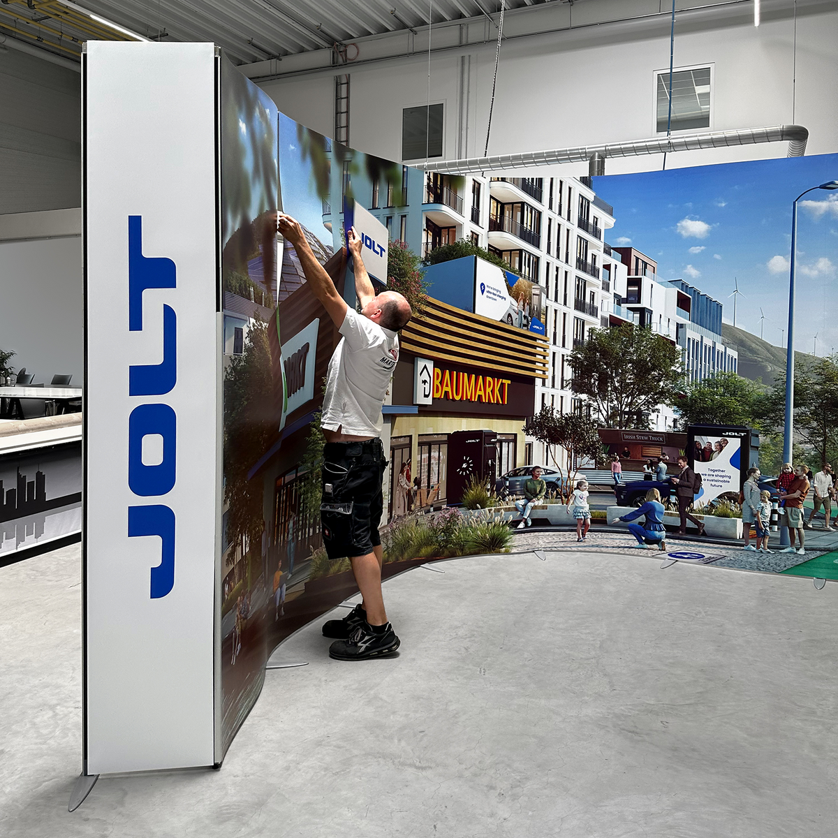 Neben dem Aufbau von Messeständen (im Hintergrund sehen Sie beispielsweise unsere flexible Messewand ISOframe Wave), übernimmt unser A-Team auch eine Vielzahl anderer Montageaufgaben. Dazu gehören Folien- und Fensterbeklebungen, Branding von Büroflächen und das Anbringen von Tapeten.