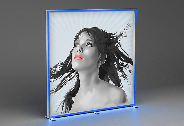 Gefertigt aus Aluminiumprofilen mit einer Tiefe von 8 cm, überzeugt der RGB Frame durch seine hochwertige Optik und einfaches Handling: Alle Elemente lassen sich werkzeugfrei und in wenigen Minuten zusammenstecken. Die Lichtkontur sorgt für eine spektakuläre Farbwirkung – steuerbar per mitgelieferter Fernbedienung. Ob einfarbig, in Farbverläufen oder mit wechselnden Effekten: Bis zu 16 Millionen Farben stehen Ihnen zur Verfügung, um Ihre Markenwelt atmosphärisch in Szene zu setzen.